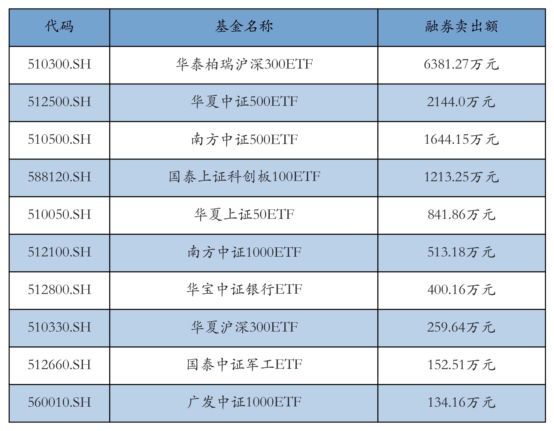 3月11日ETF融券卖出额前三位分别为:华泰柏瑞沪深300ETF(6381.27万元)、华夏中证500ETF(2144.0万元)和南方中证500ETF(1644.15万元),前10具体见下表: