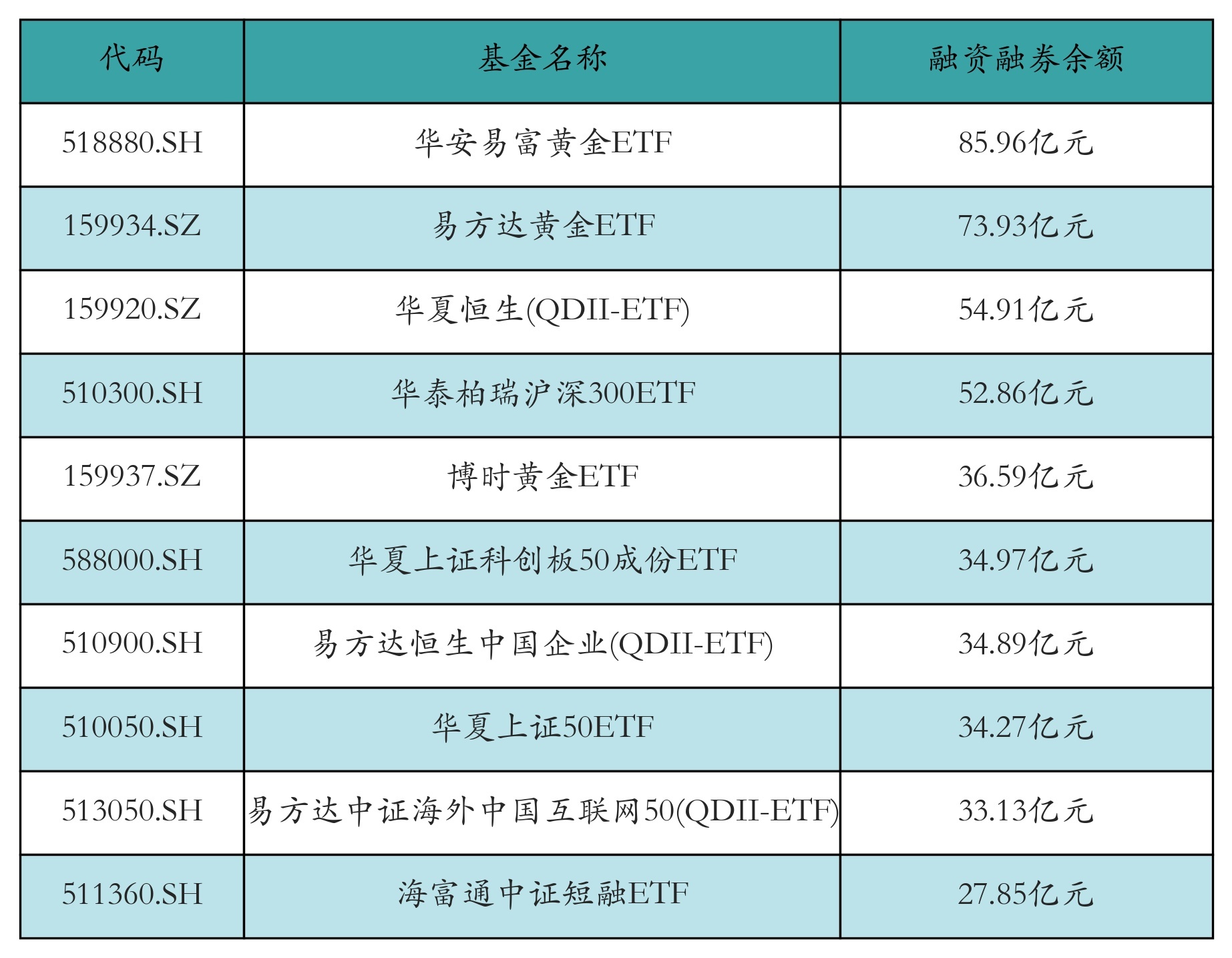 3月11日ETF两融余额前三位分别为:华安易富黄金ETF(85.96亿元)、易方达黄金ETF(73.93亿元)和华夏恒生(QDII-ETF)(54.91亿元),前10具体见下表: