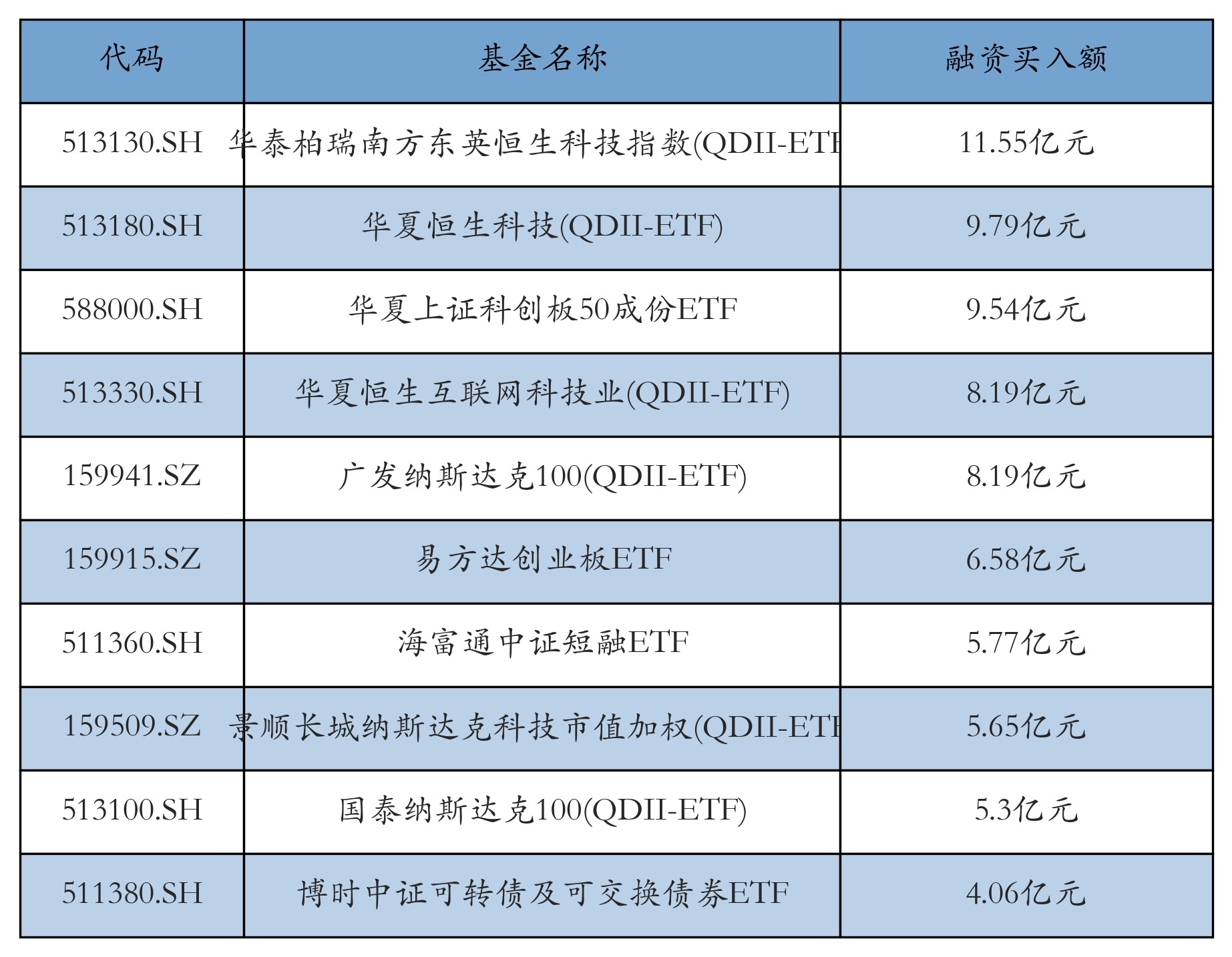 3月11日ETF融资买入额前三位分别为:华泰柏瑞南方东英恒生科技指数(QDII-ETF)(11.55亿元)、华夏恒生科技(QDII-ETF)(9.79亿元)和华夏上证科创板50成份ETF(9.54亿元),前10具体见下表: