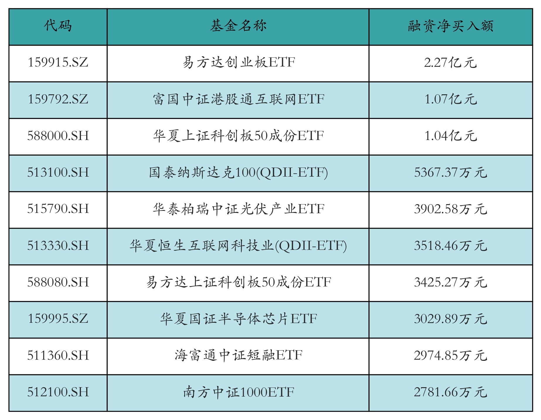 3月11日ETF融资净买入额前三位分别为:易方达创业板ETF(2.27亿元)、富国中证港股通互联网ETF(1.07亿元)和华夏上证科创板50成份ETF(1.04亿元),前10具体见下表: